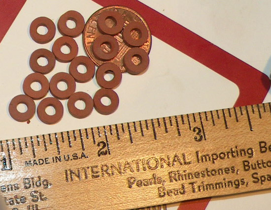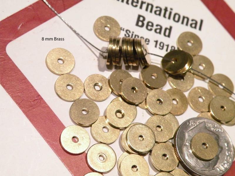 Raw Brass Discs, 8mm around with a small center hole. (smaller than it looks in the photo) Solid Brass, 100 pieces weighs 1 1/3 ounces. Strings to more than 3 ½ inches $3.00 per 100 pieces.