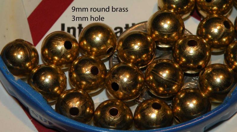 Solid Brass round bead 3/8 inch (9.5 mm ) with a 1/8 inch (3mm) hole. These beads are made in USA 50 beads weighs 71.5 grams, which is 2 ½ ounces. Strings to more than 18 inches Not particularly light weight $5 for 50 pieces