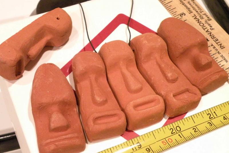 Clay Heads 2 inches long 1 inch wide, and ½ inch thick. There are 2 distinct styles. Each one weighs almost an ounce. String them, paint them, glue them onto something. Glue something on to them. 12 pieces, 6 of each type $6 plus shipping email to order.