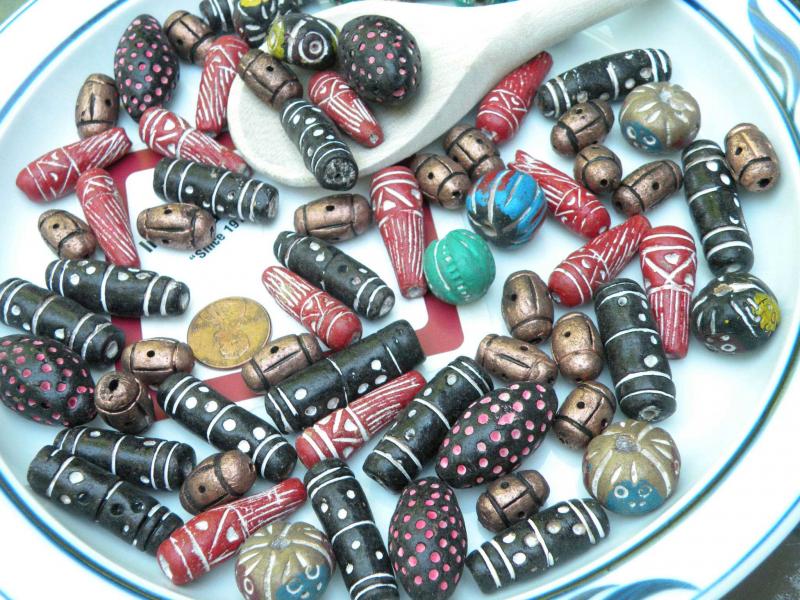 Painted clay beads, assorted sizes, assorted colors - all mixed with a wooden spoon. The photo shows a typical bag of ½ pound. The large black oval with pink dots is 1 ¼ inches long, the bronze small one is almost ¾ inches long. I counted 66 beads, but each bag will be different, taken from the same master mix. ½ pound is $6 plus shipping. Email to order or for any questions.