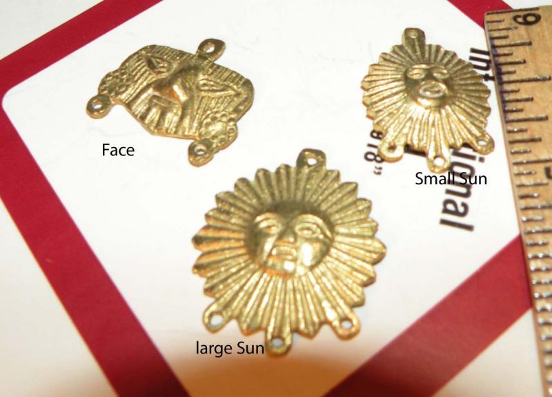 Brass Symbolic Pendants from Guatemala., the large sun is 24mm around the small sun is 18mm and the face is 20mm across and 12 mm high there are 25.5mm to an inch Any 4 pieces $3., order by name