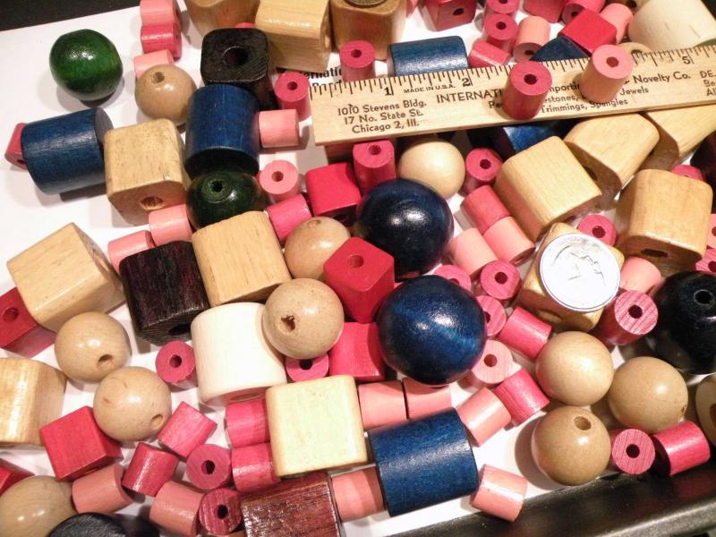 Large Wooden Beads. These are solid and sincere wood, made in USA circa 1968. Assorted Shapes and Colors. The photo shows a typical one pound bag. at least 140 pieces The pink squares are bright red. 1 pound is $6 plus shipping.