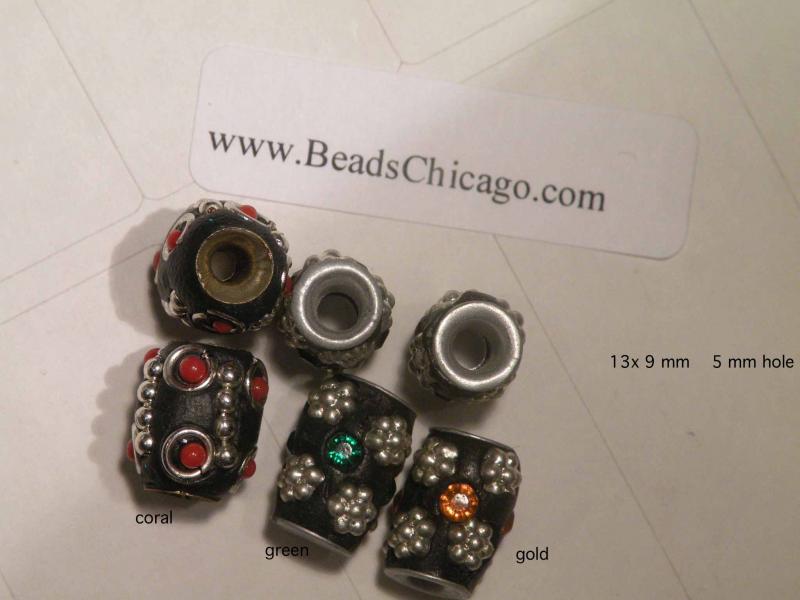 Large Hole Pan D’Ore, a holiday favorite. 13mm long x9mm wide 5mm hole -will string onto a chain or heavy cord. 15 pieces of a color in a bag. $3 plus shipping,