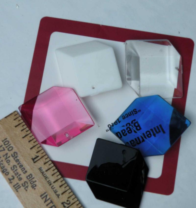 Parallelograms. Very cool. 5 colors from the 70’s pink, black, white, blue, and clear . As in the photo. ¾ inch on its side, ¼ inch thick. High Quality Acrylic, from Germany. 6 pieces, name your colors. $3. For 50 pieces randomly assorted the price is $18. email to order.