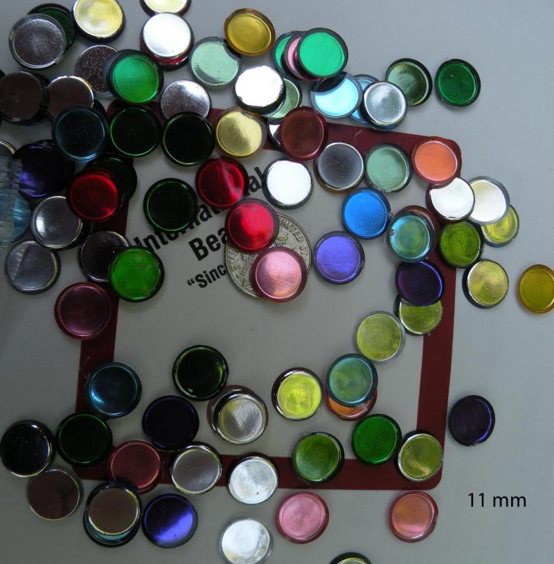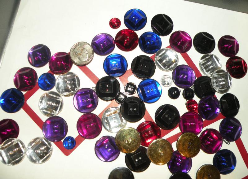 Acrylic Sew On Buttons. Foil back with 2 holes. The largest is the size of a Quarter. (25mm) Assorted sizes and colors. 3 ounces – more than 40 pieces. $6 plus shipping email to order.